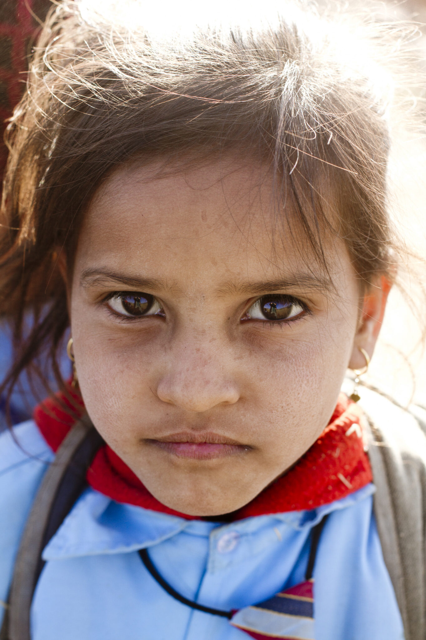 A young girl walking home from school stops to get her photo taken in Nepal.